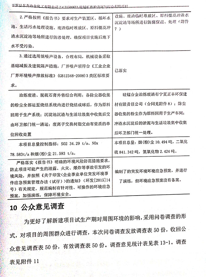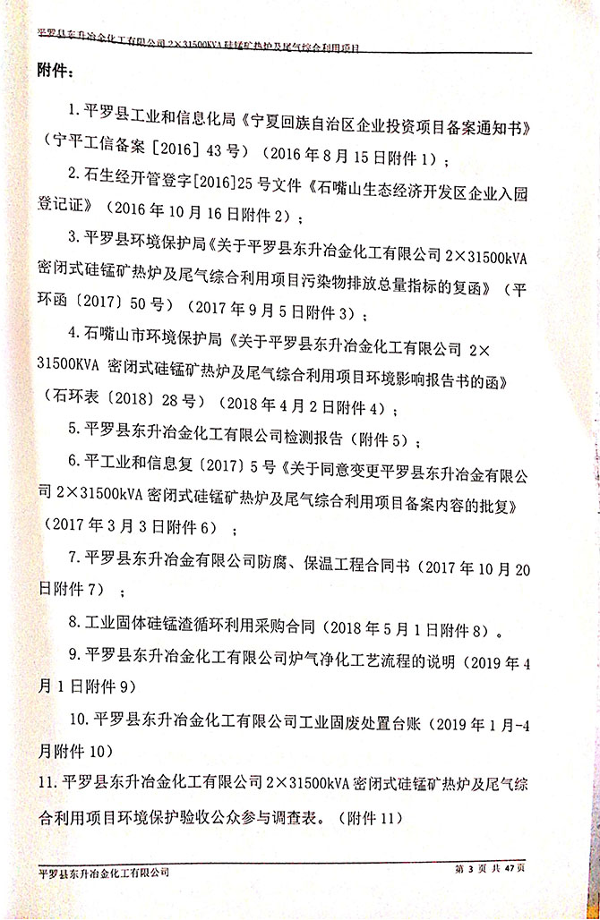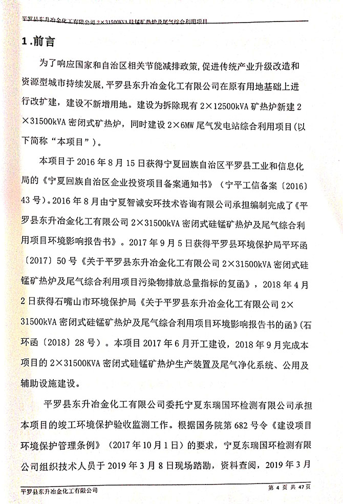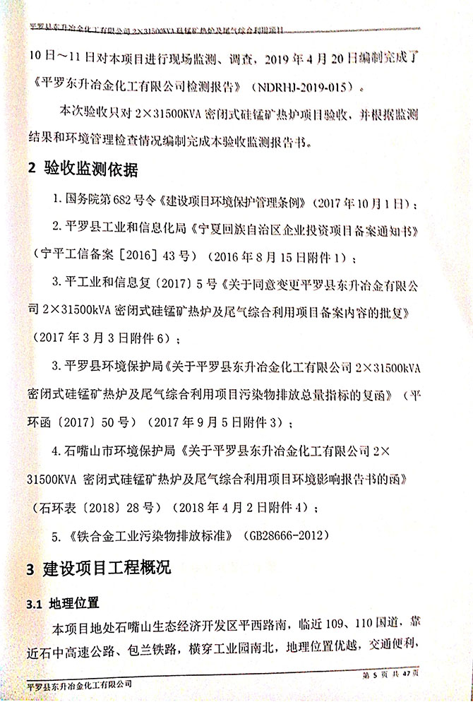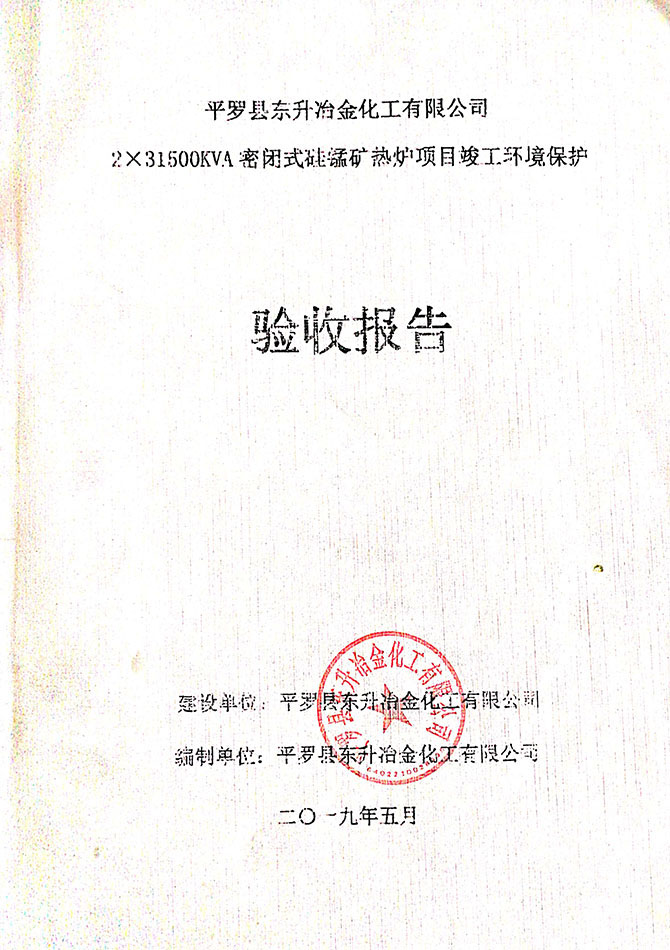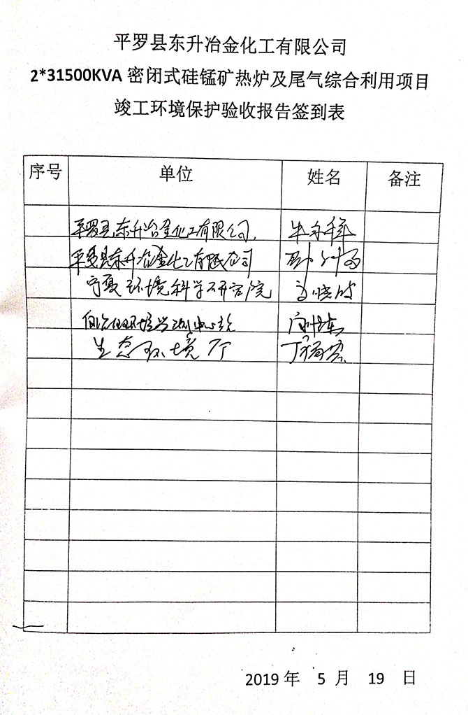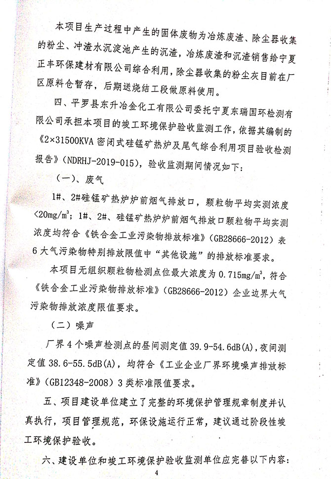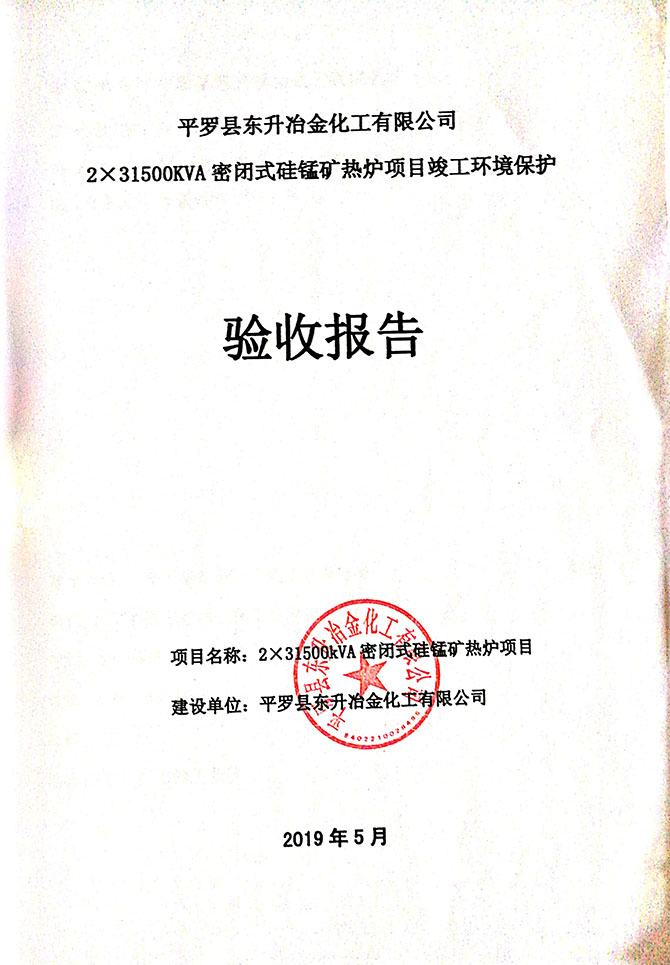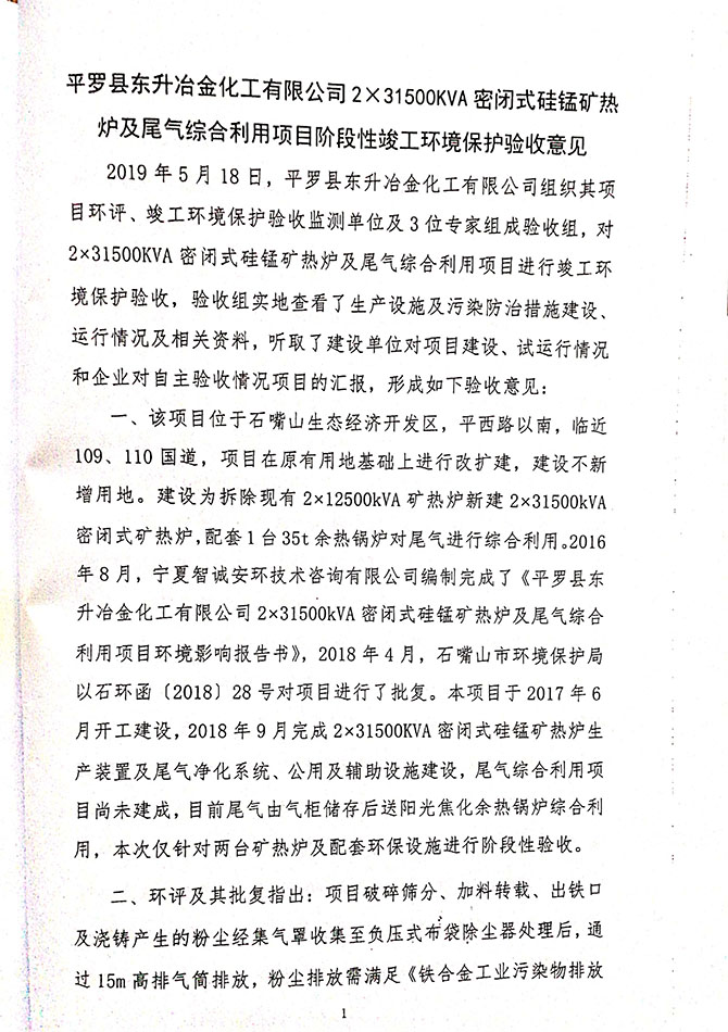 2019 年 5 月 19 日平罗县东升冶金化工有限公司组织环评方、竣工环 境保护验收监测单位及三位专家组成验收小组,对 2×31500KVA 密闭式硅 锰矿热炉项目(以下简称该项目)进行阶段性竣工环境保护验收,现将验 收意见公示如下: