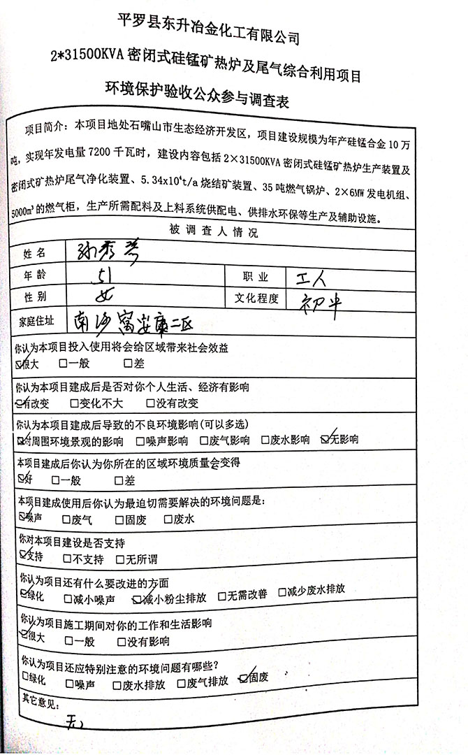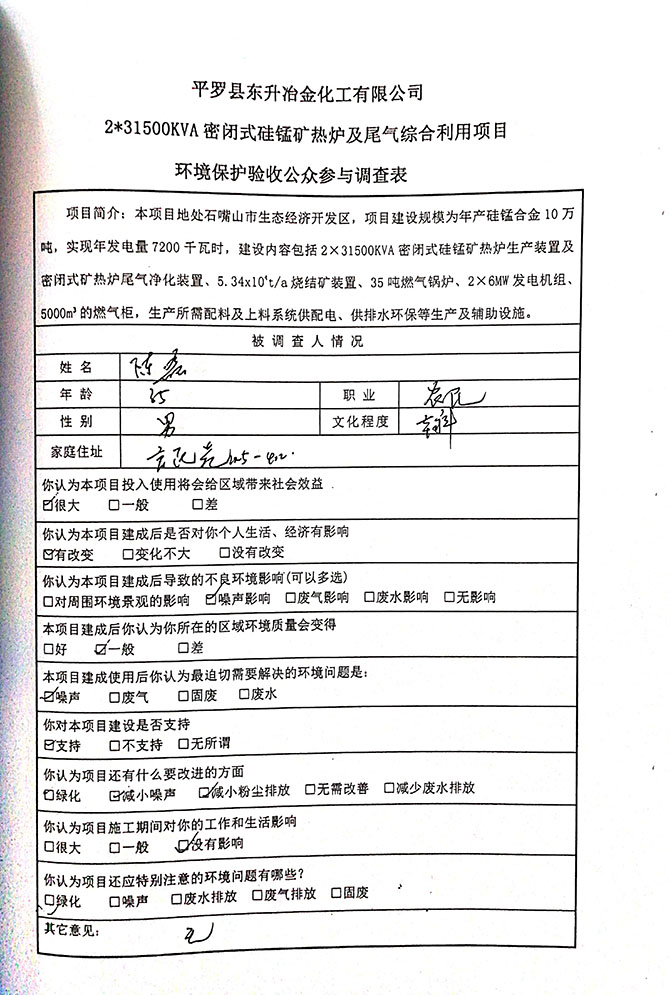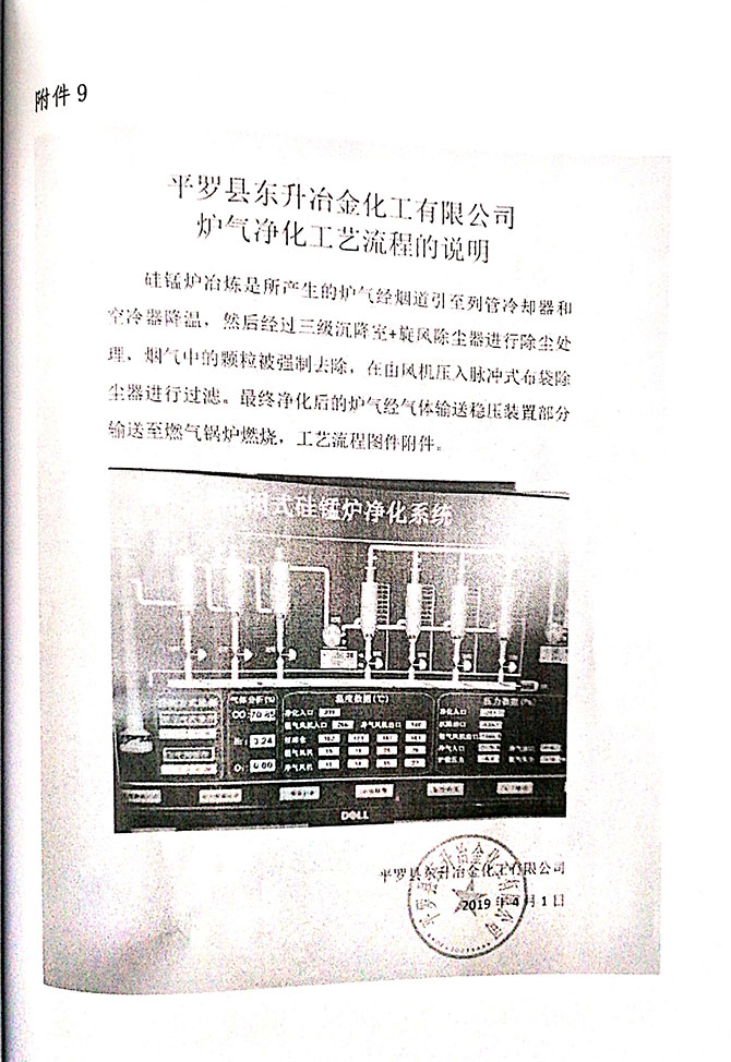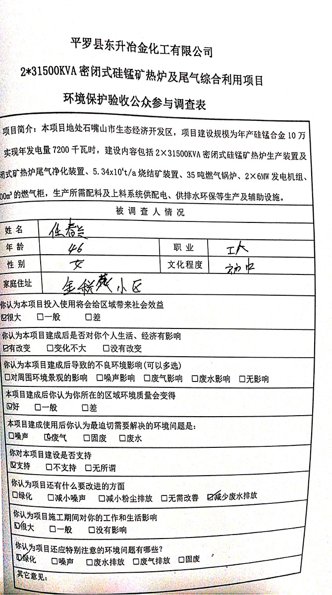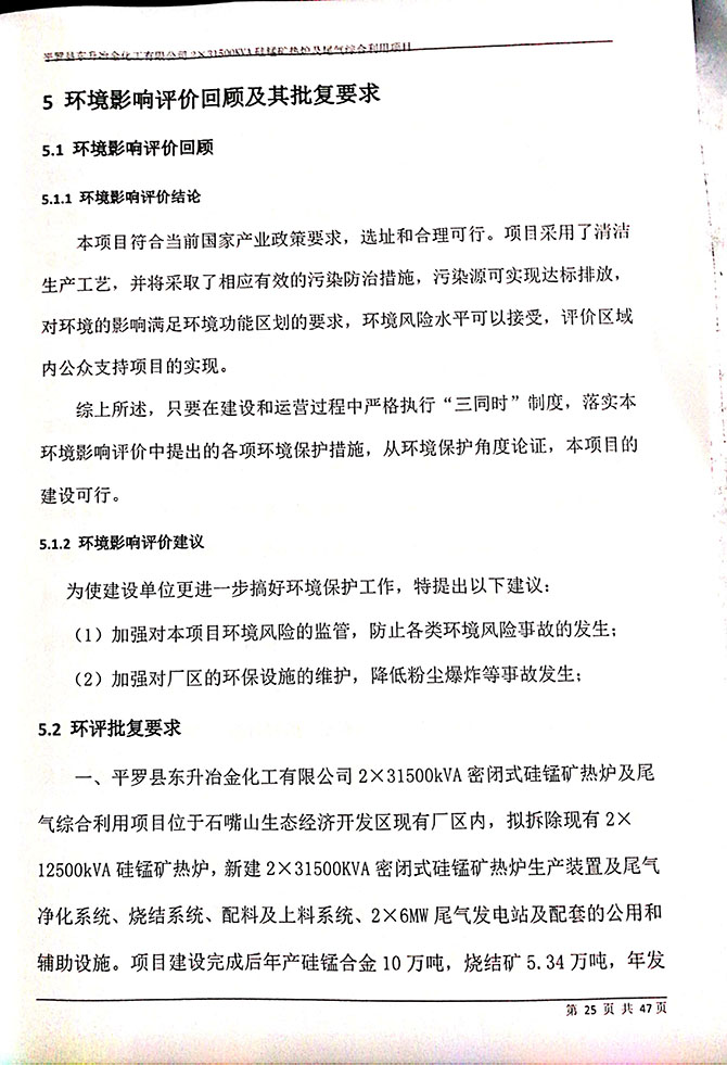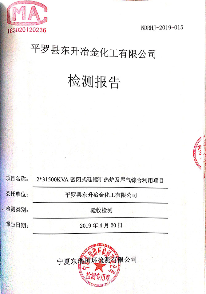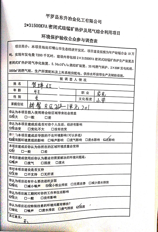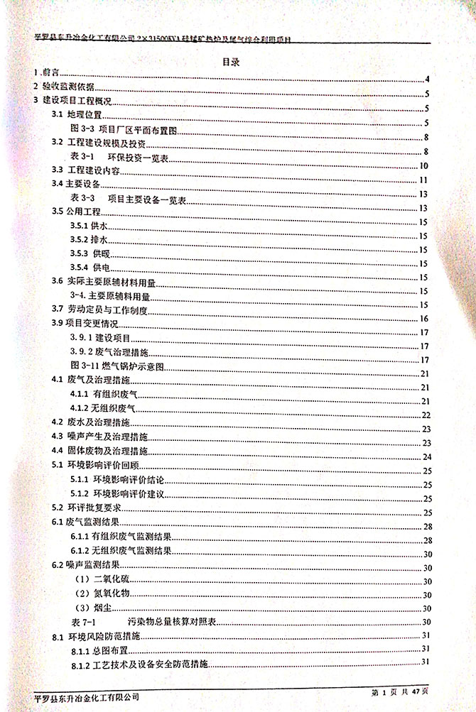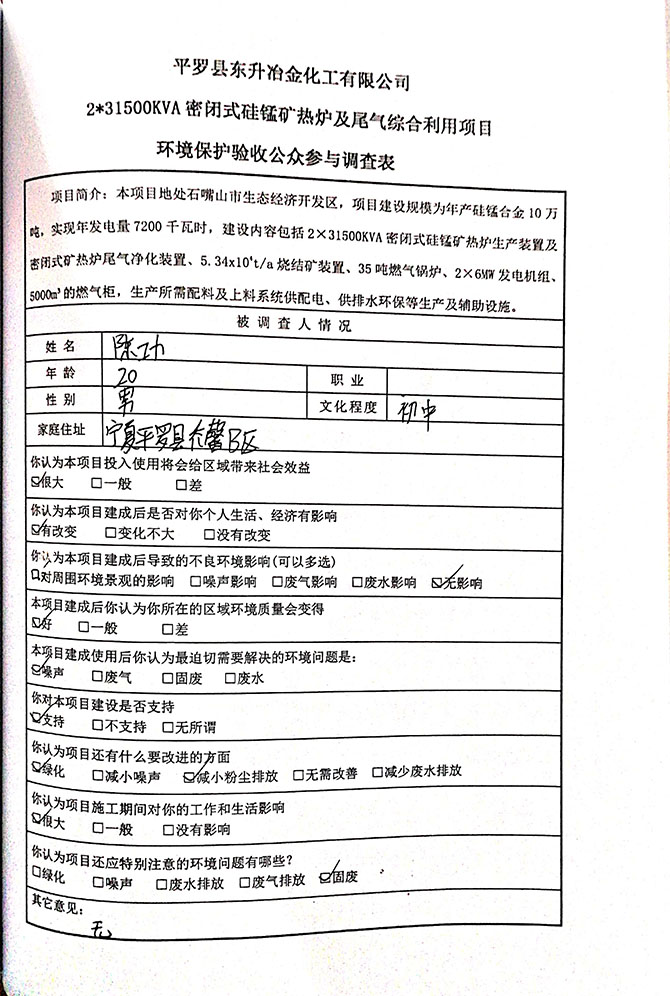 2019 年 5 月 19 日平罗县东升冶金化工有限公司组织环评方、竣工环 境保护验收监测单位及三位专家组成验收小组,对 2×31500KVA 密闭式硅 锰矿热炉项目(以下简称该项目)进行阶段性竣工环境保护验收,现将验 收意见公示如下: