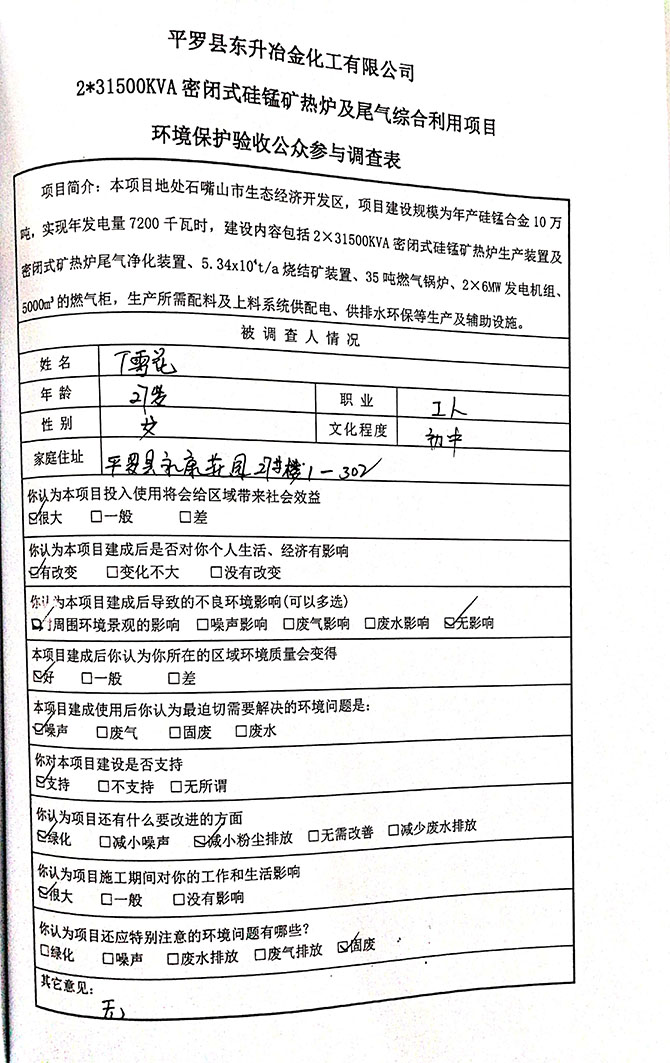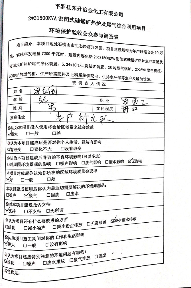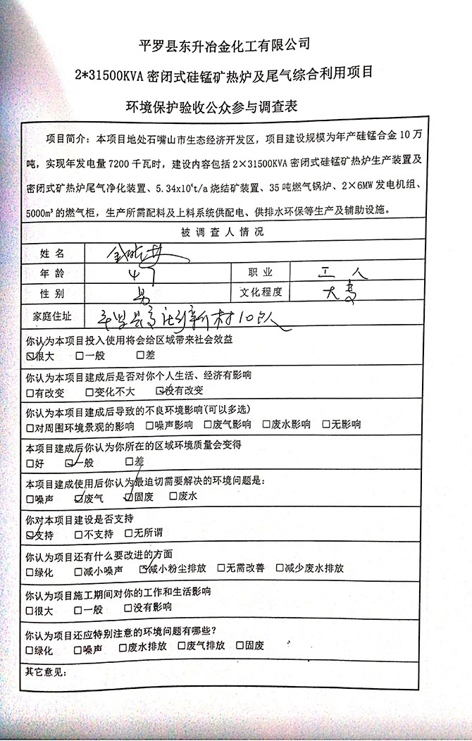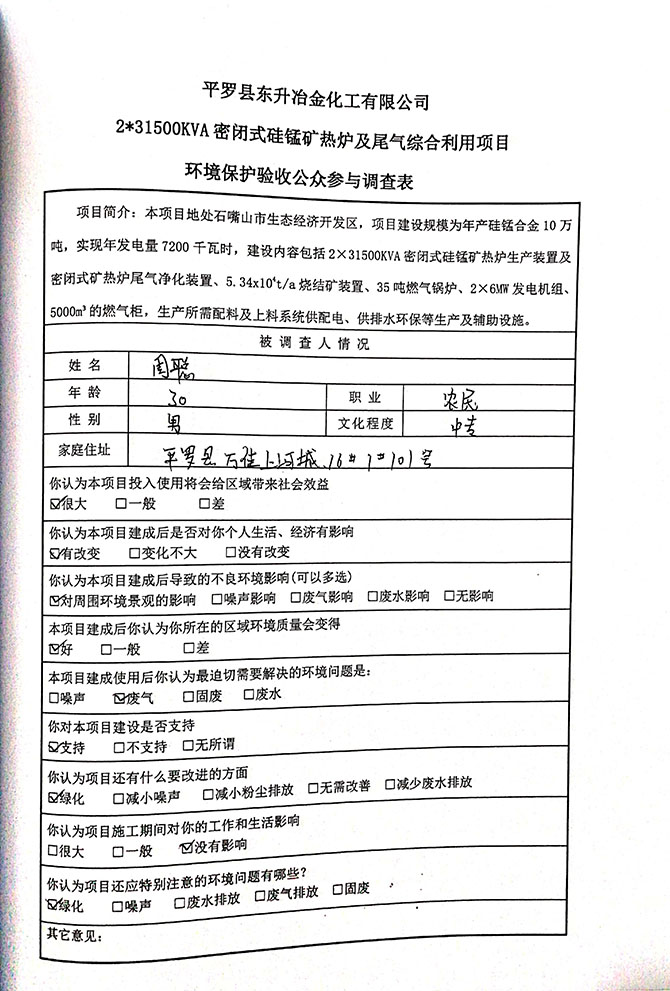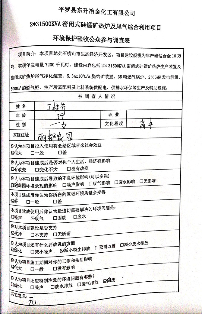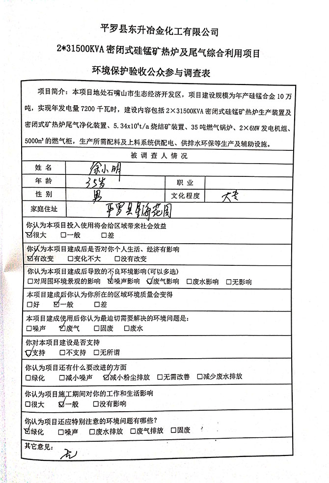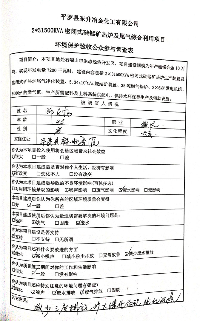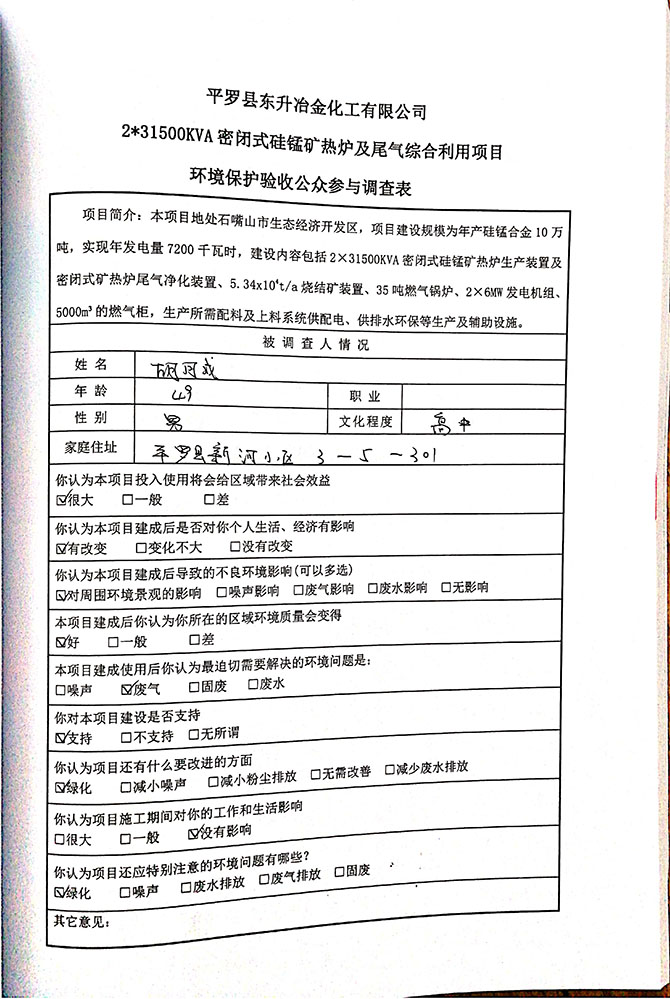 2019 年 5 月 19 日平罗县东升冶金化工有限公司组织环评方、竣工环 境保护验收监测单位及三位专家组成验收小组,对 2×31500KVA 密闭式硅 锰矿热炉项目(以下简称该项目)进行阶段性竣工环境保护验收,现将验 收意见公示如下: