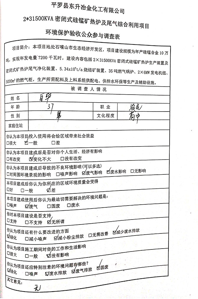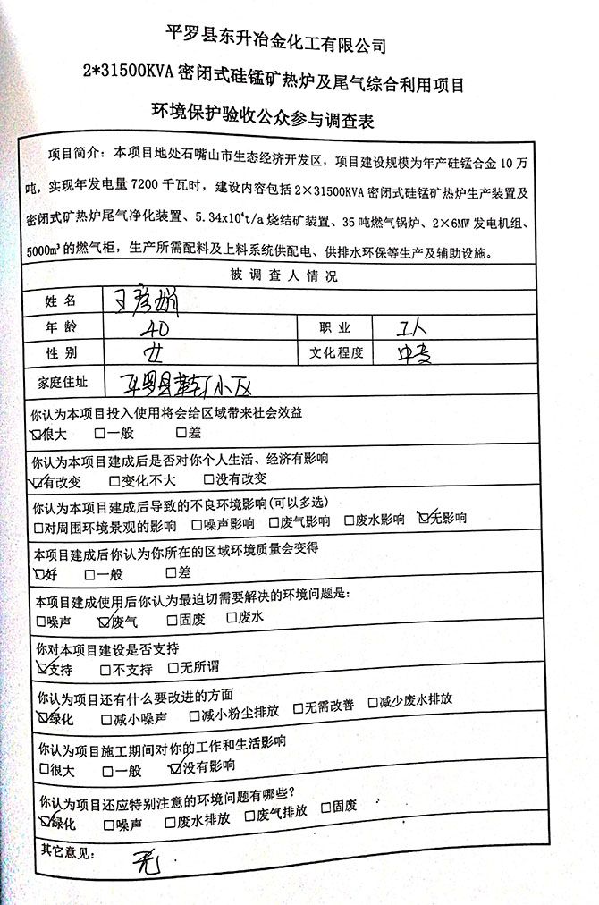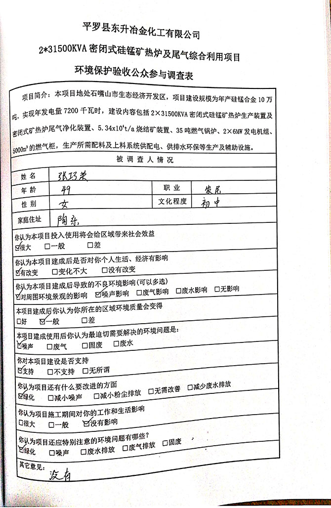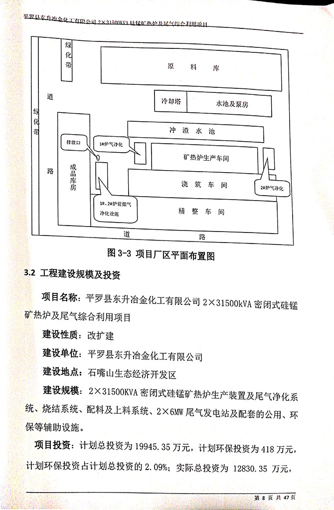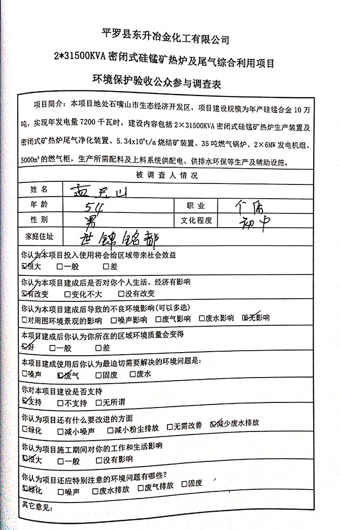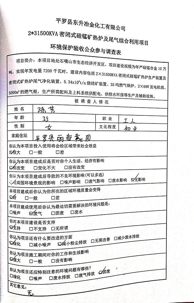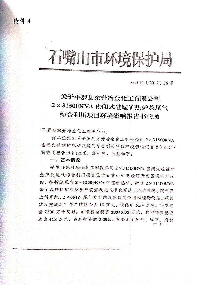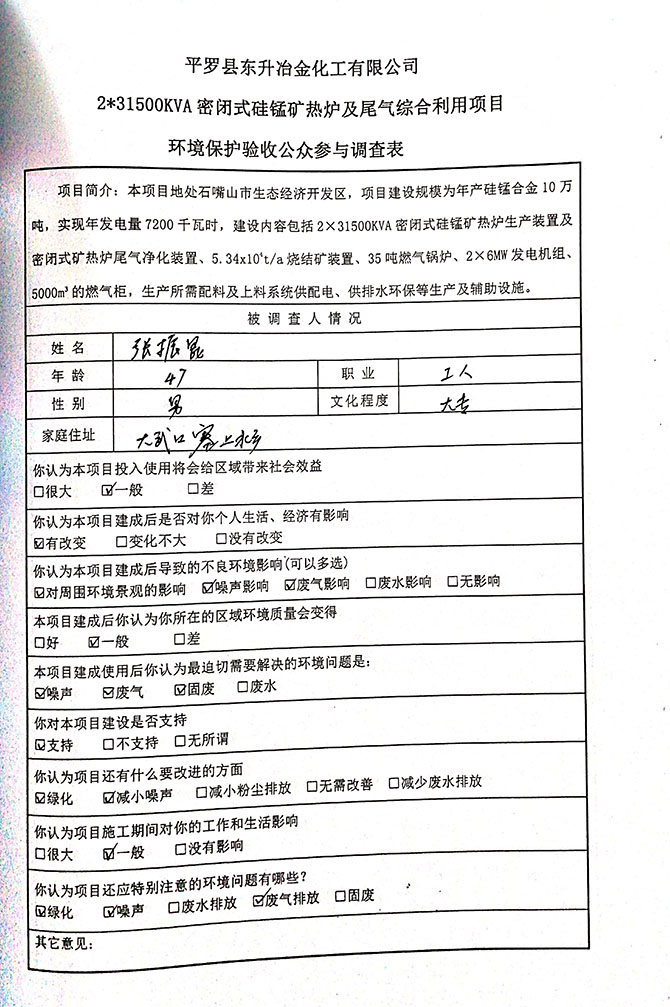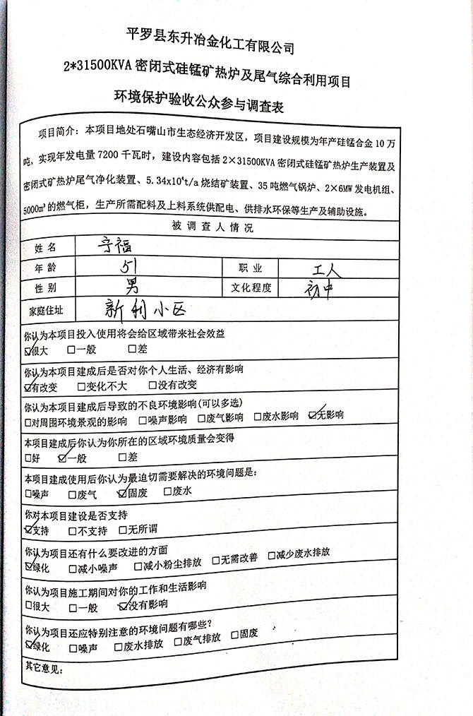 2019 年 5 月 19 日平罗县东升冶金化工有限公司组织环评方、竣工环 境保护验收监测单位及三位专家组成验收小组,对 2×31500KVA 密闭式硅 锰矿热炉项目(以下简称该项目)进行阶段性竣工环境保护验收,现将验 收意见公示如下: