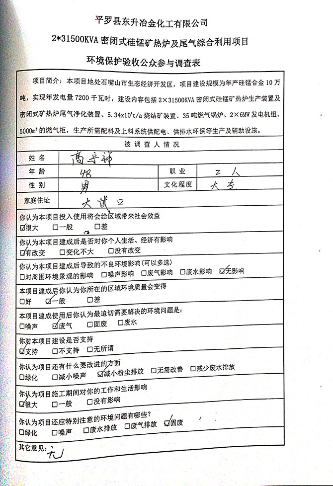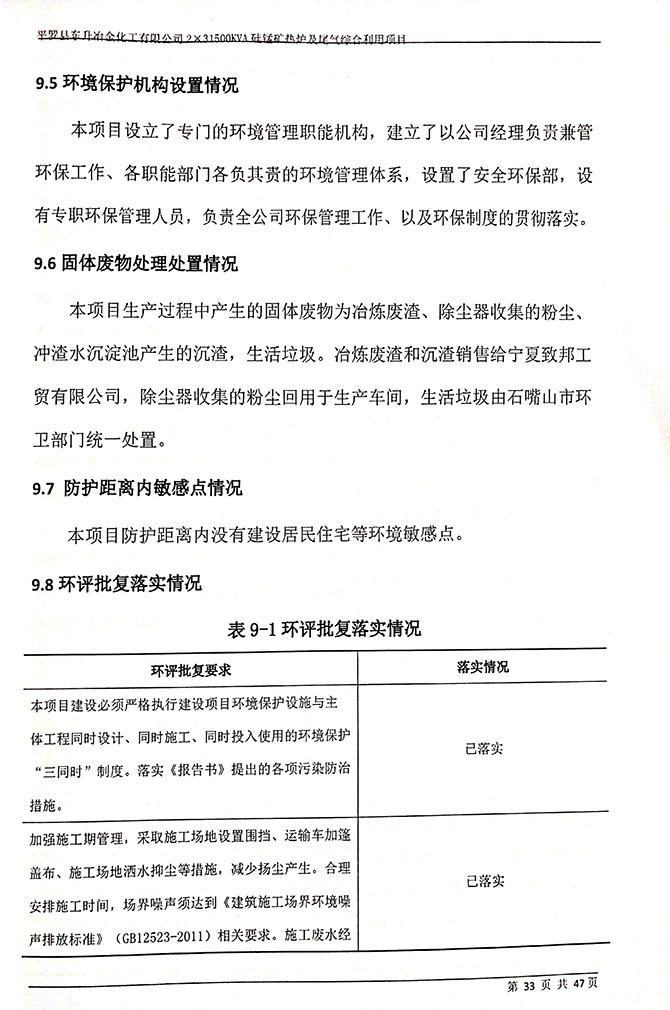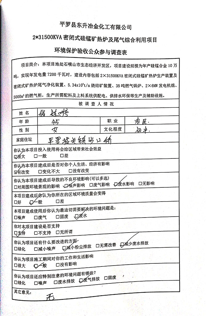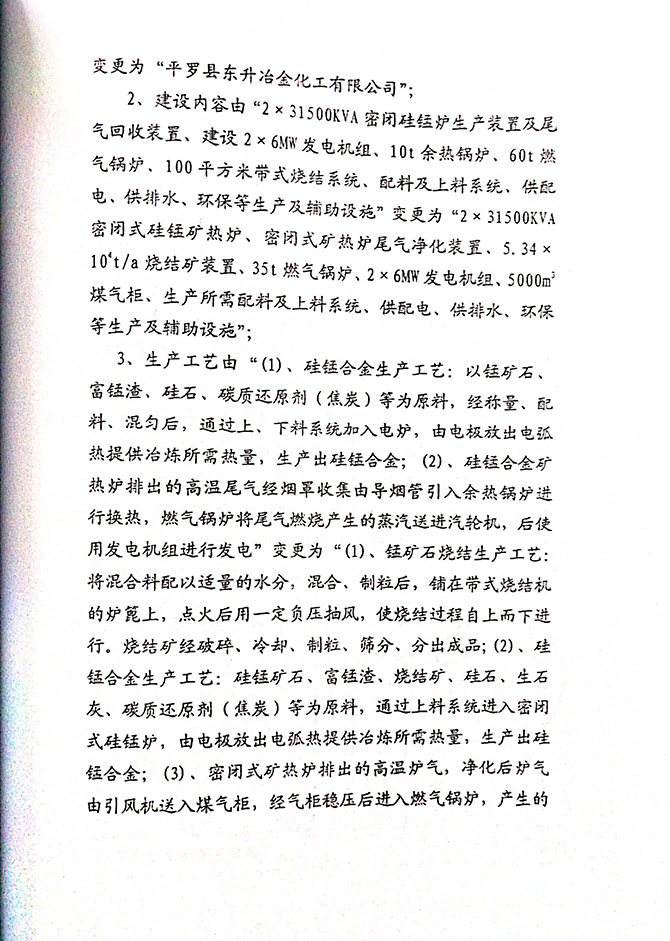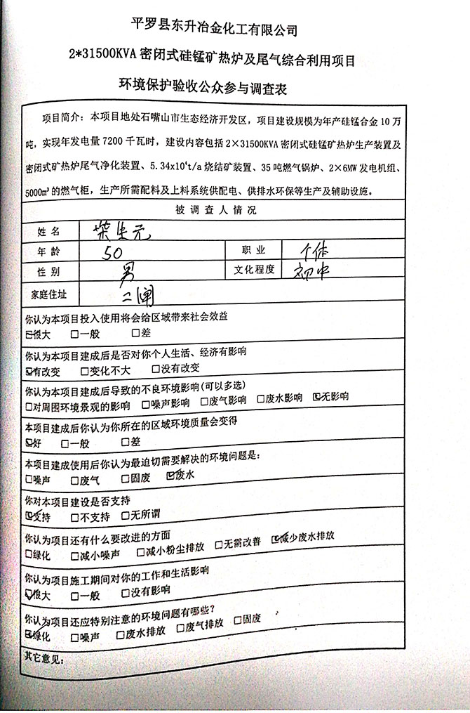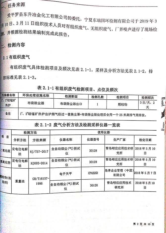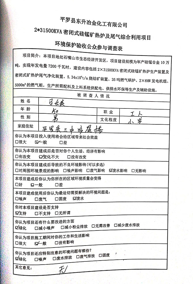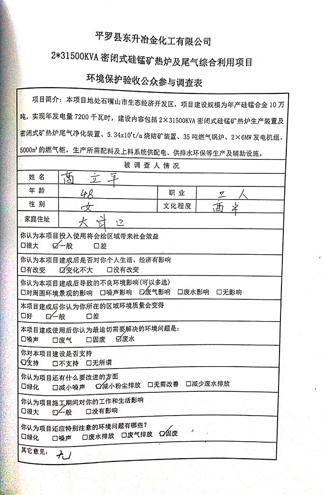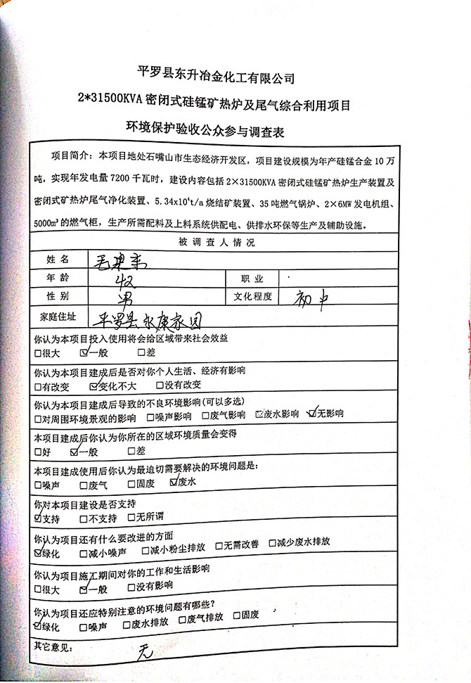 2019 年 5 月 19 日平罗县东升冶金化工有限公司组织环评方、竣工环 境保护验收监测单位及三位专家组成验收小组,对 2×31500KVA 密闭式硅 锰矿热炉项目(以下简称该项目)进行阶段性竣工环境保护验收,现将验 收意见公示如下:
