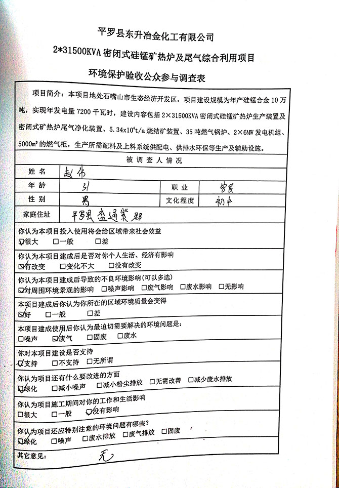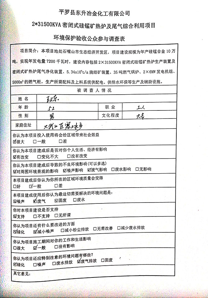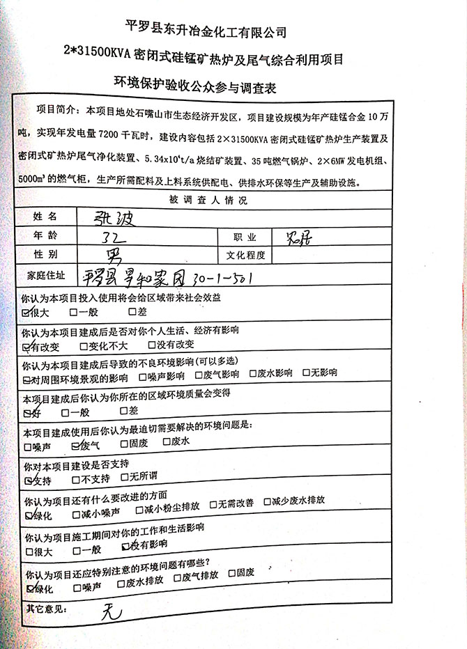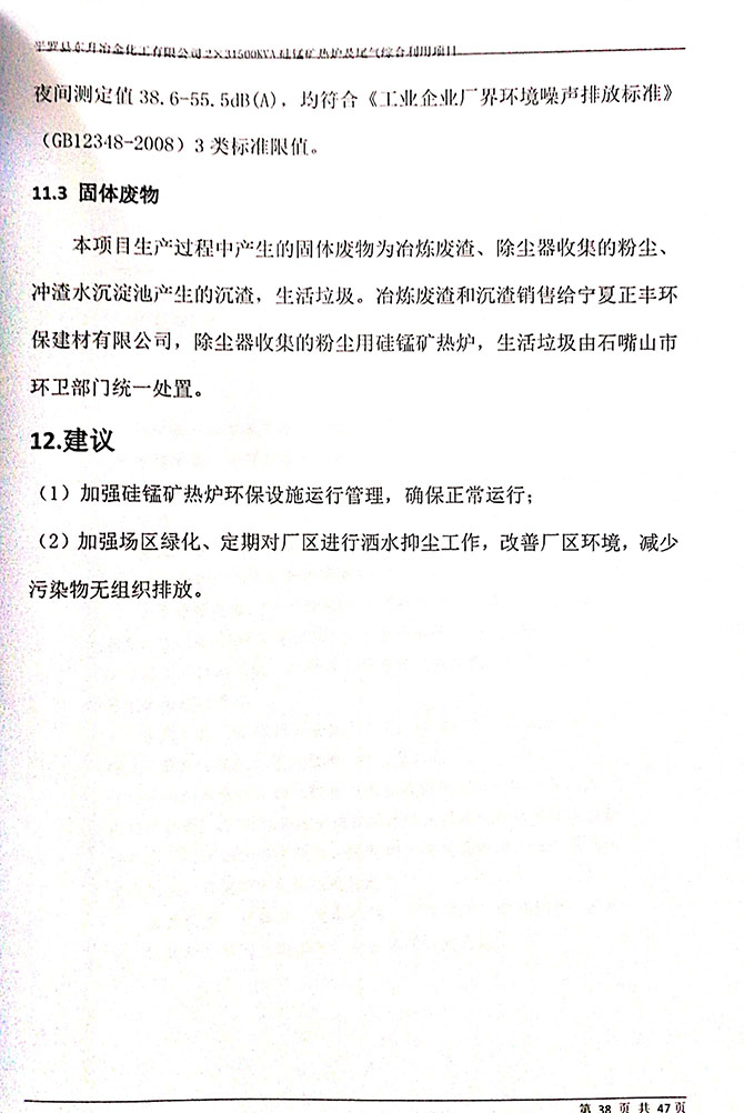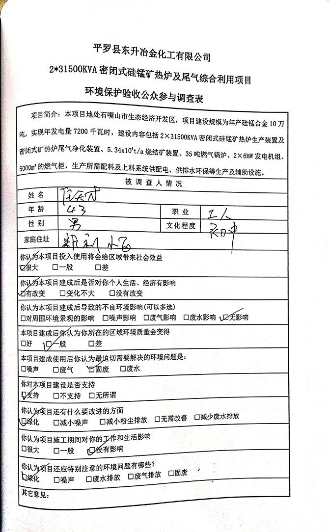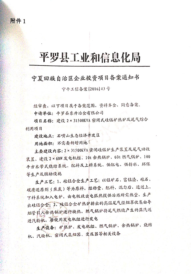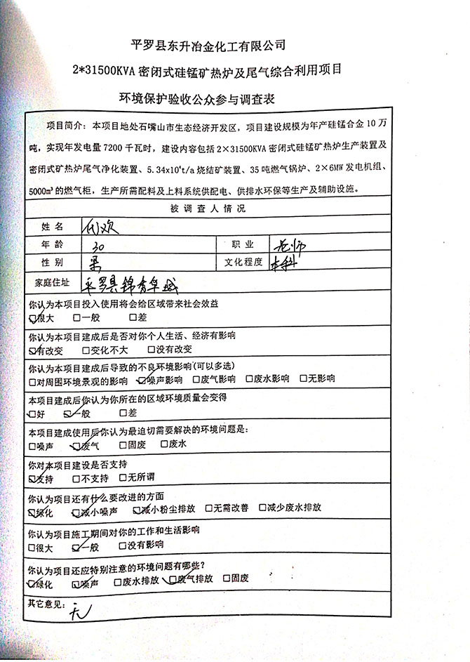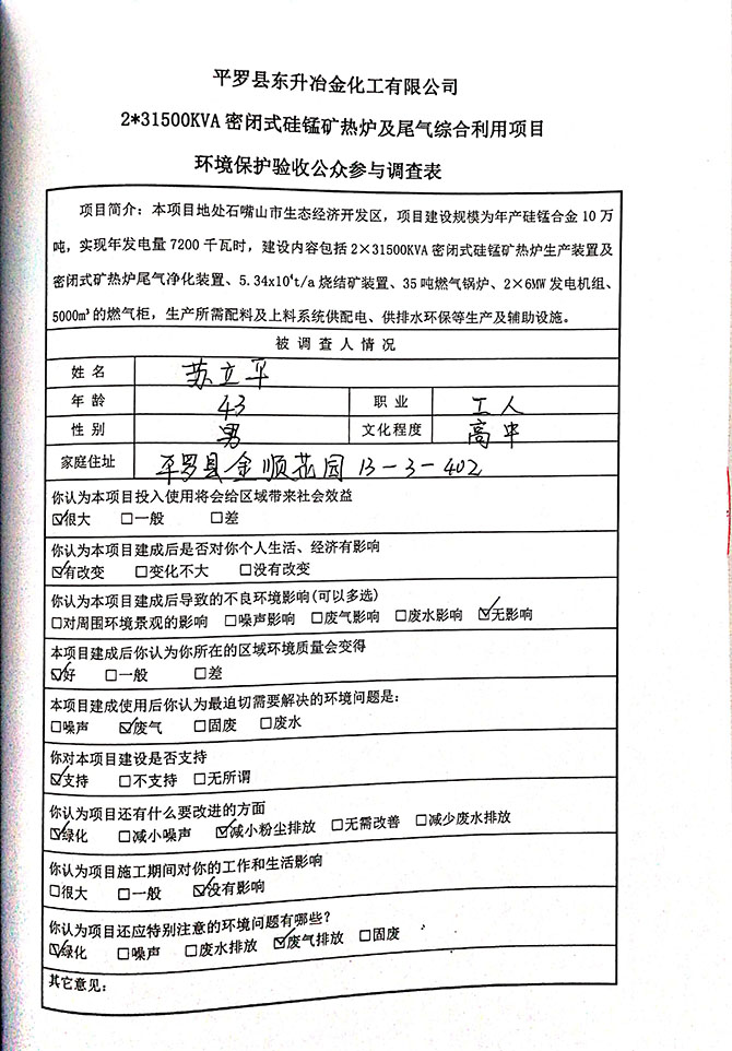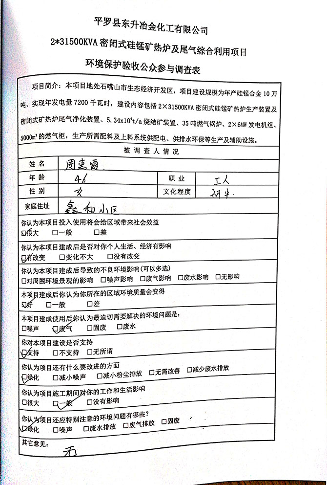 2019 年 5 月 19 日平罗县东升冶金化工有限公司组织环评方、竣工环 境保护验收监测单位及三位专家组成验收小组,对 2×31500KVA 密闭式硅 锰矿热炉项目(以下简称该项目)进行阶段性竣工环境保护验收,现将验 收意见公示如下: