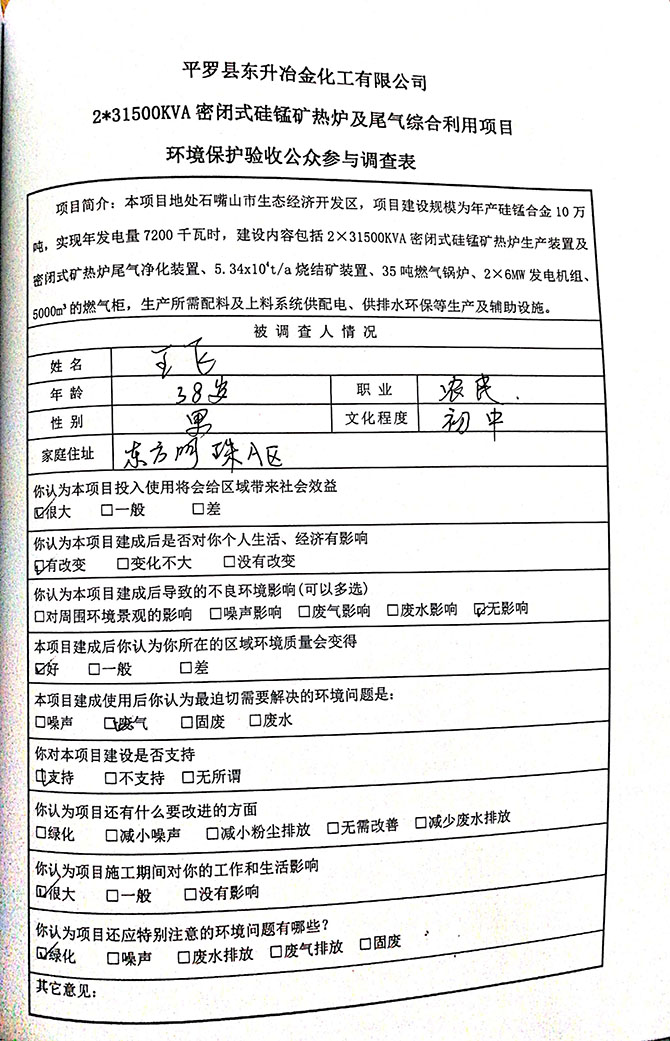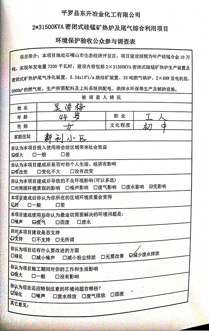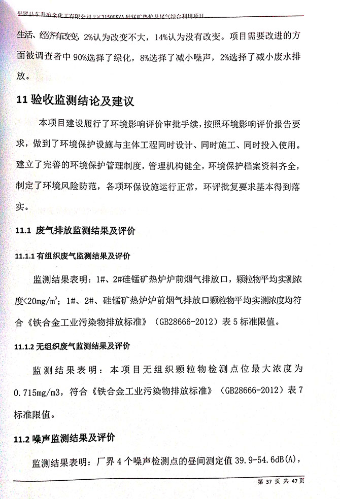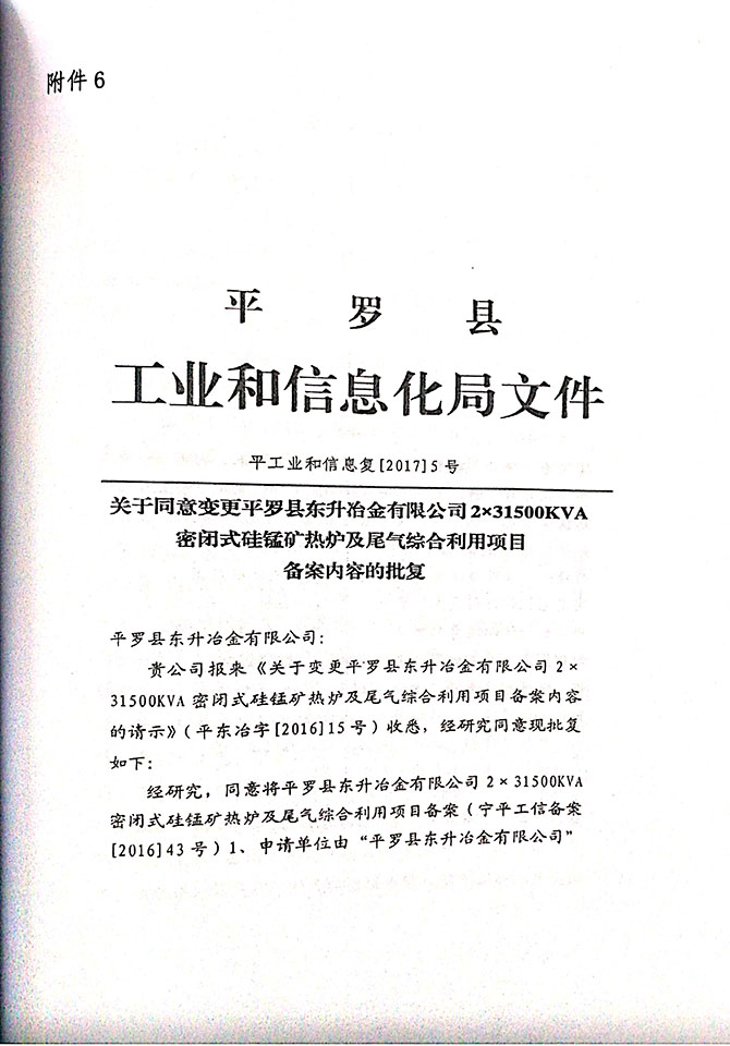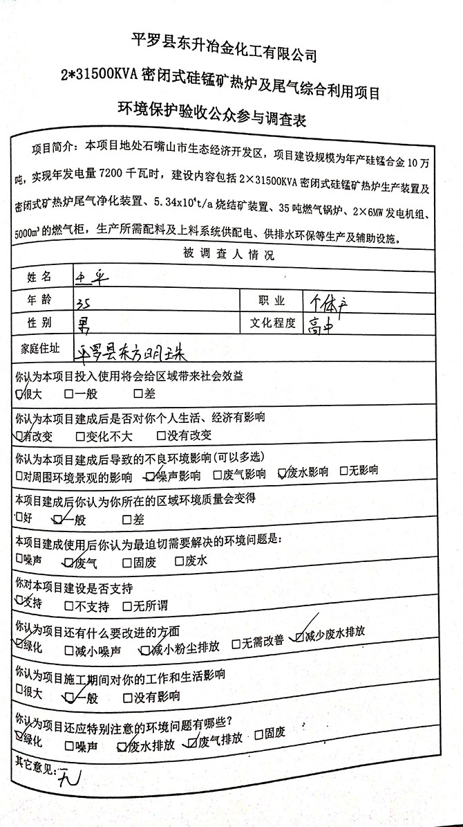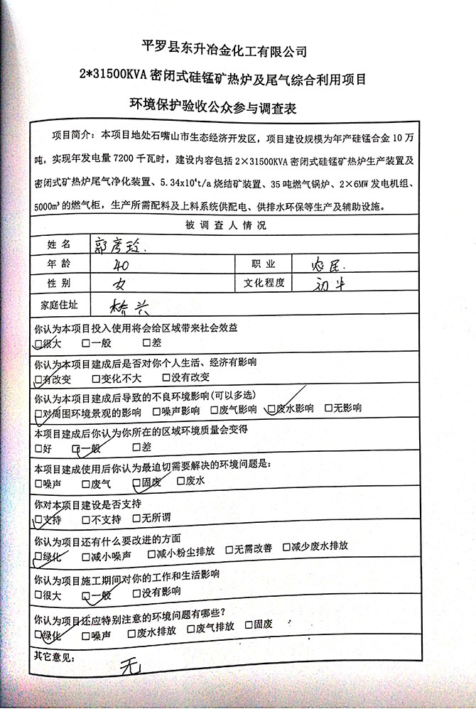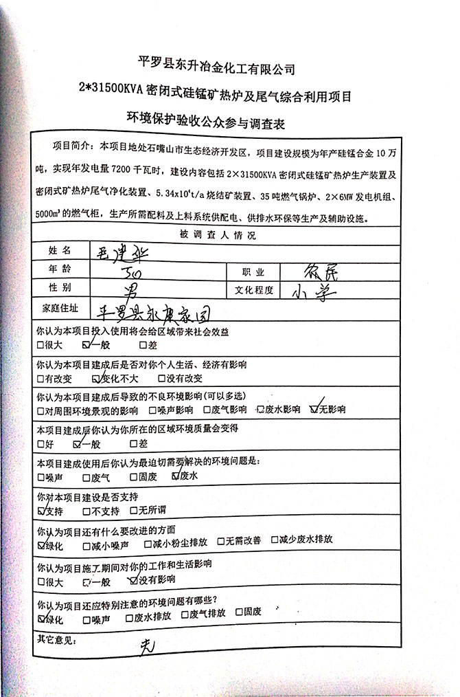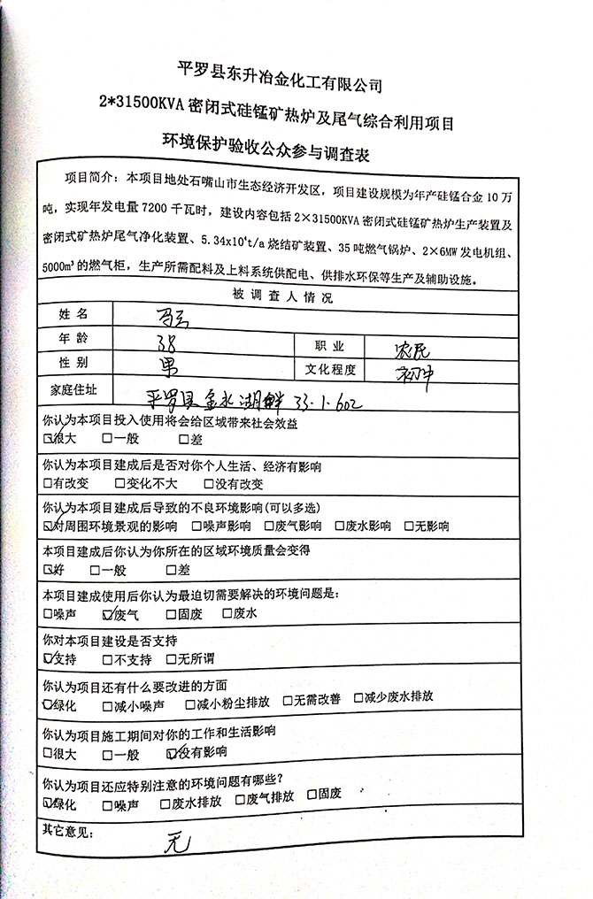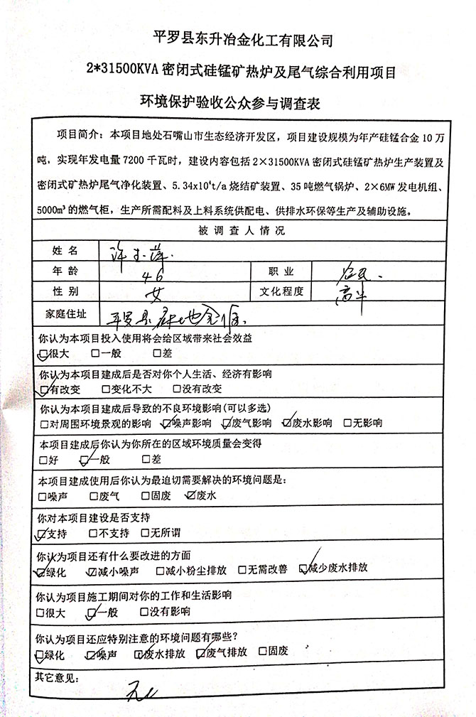 2019 年 5 月 19 日平罗县东升冶金化工有限公司组织环评方、竣工环 境保护验收监测单位及三位专家组成验收小组,对 2×31500KVA 密闭式硅 锰矿热炉项目(以下简称该项目)进行阶段性竣工环境保护验收,现将验 收意见公示如下: