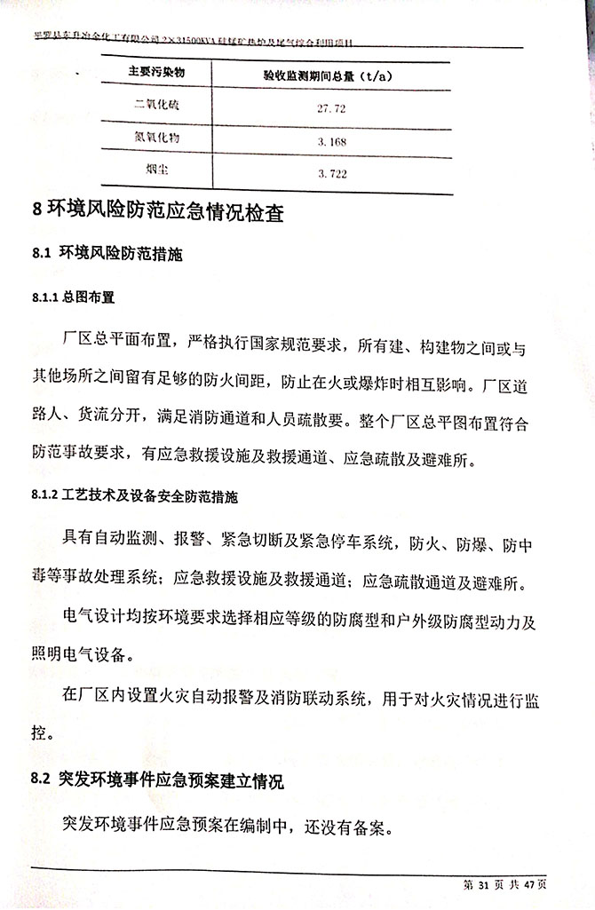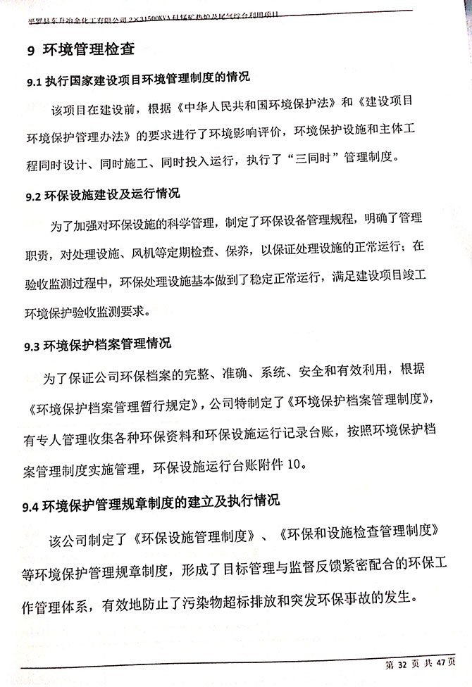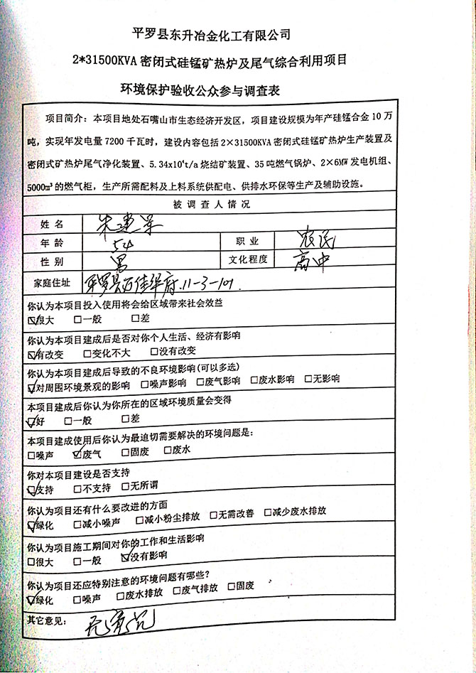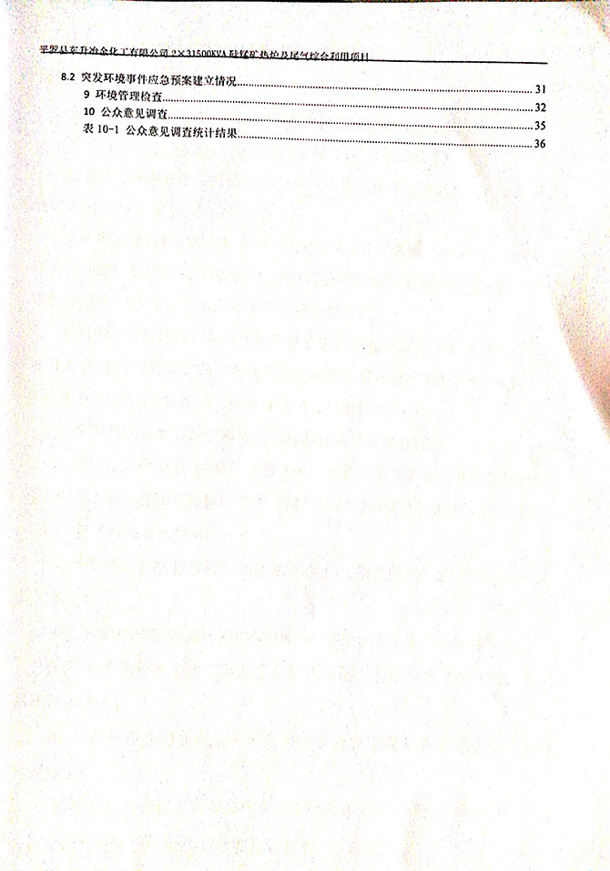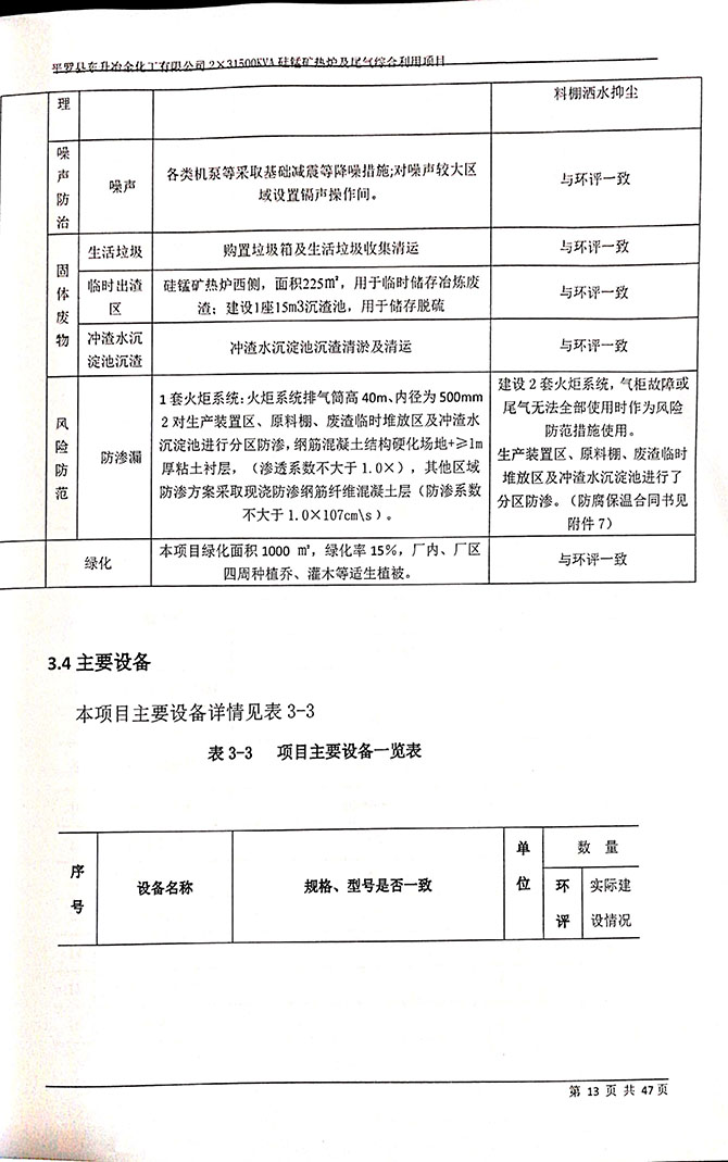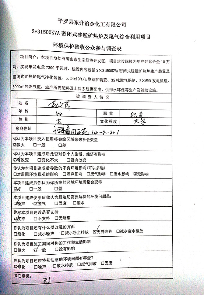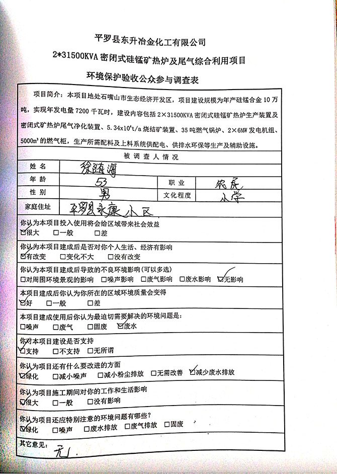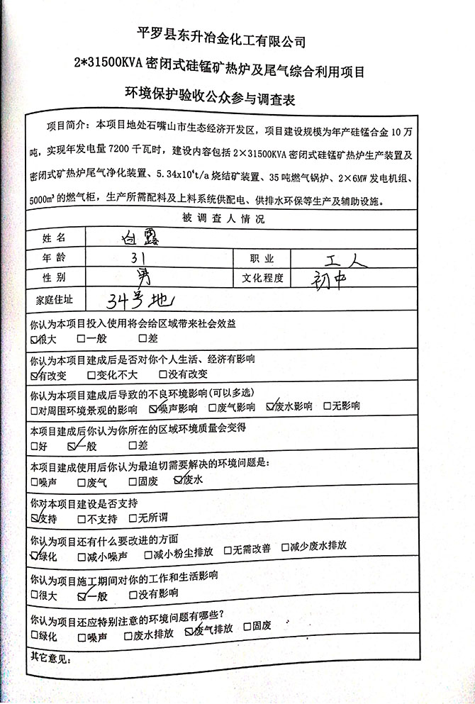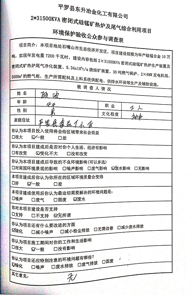 2019 年 5 月 19 日平罗县东升冶金化工有限公司组织环评方、竣工环 境保护验收监测单位及三位专家组成验收小组,对 2×31500KVA 密闭式硅 锰矿热炉项目(以下简称该项目)进行阶段性竣工环境保护验收,现将验 收意见公示如下: