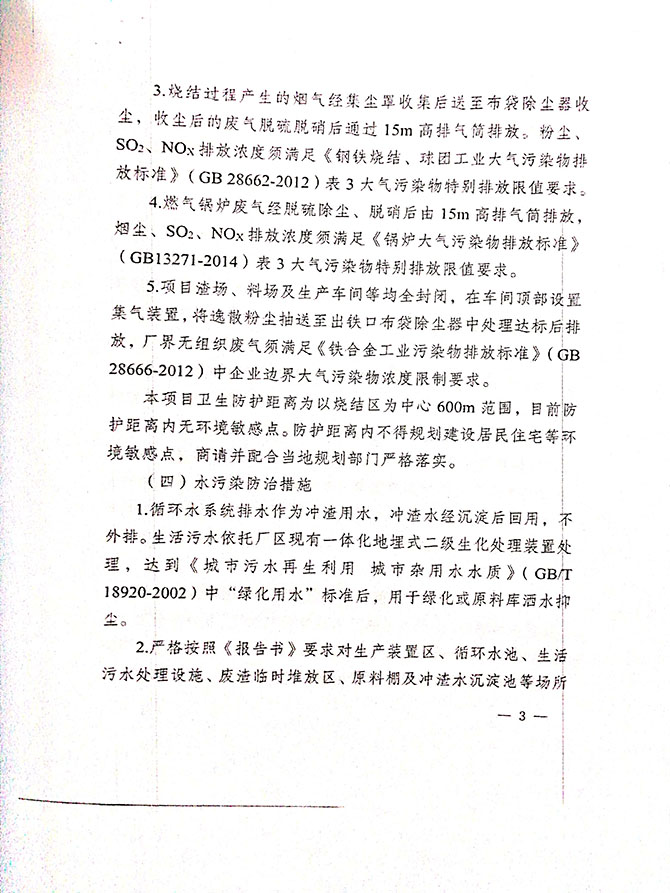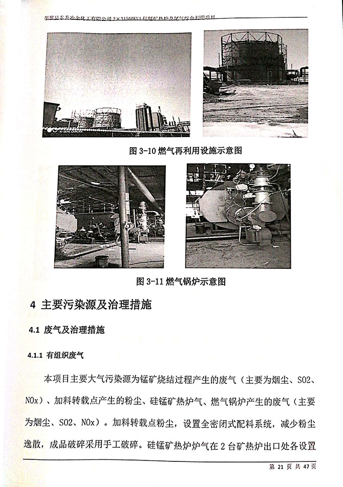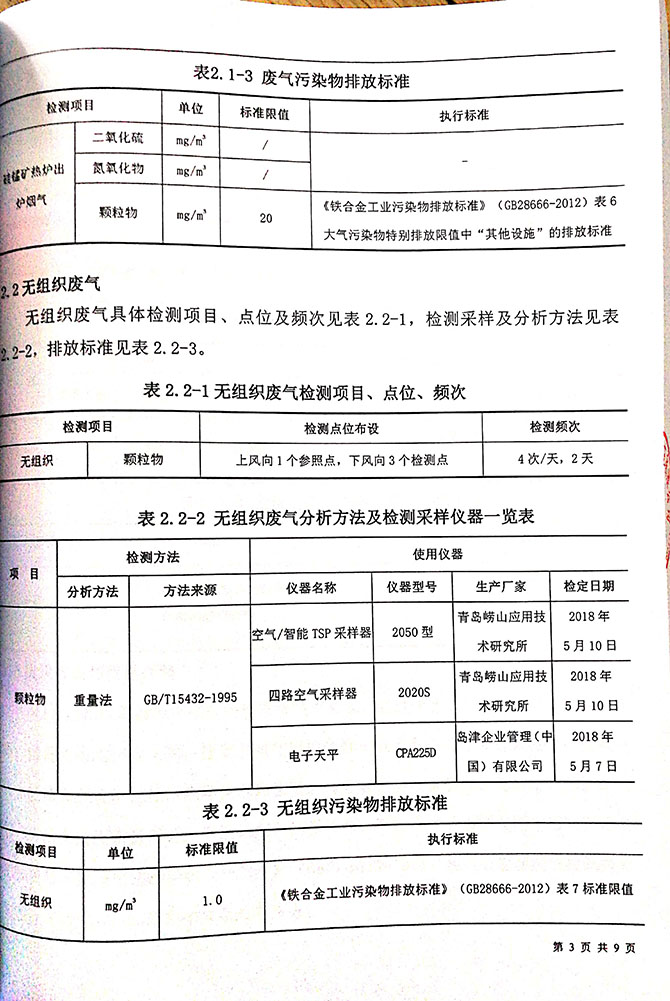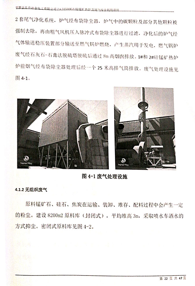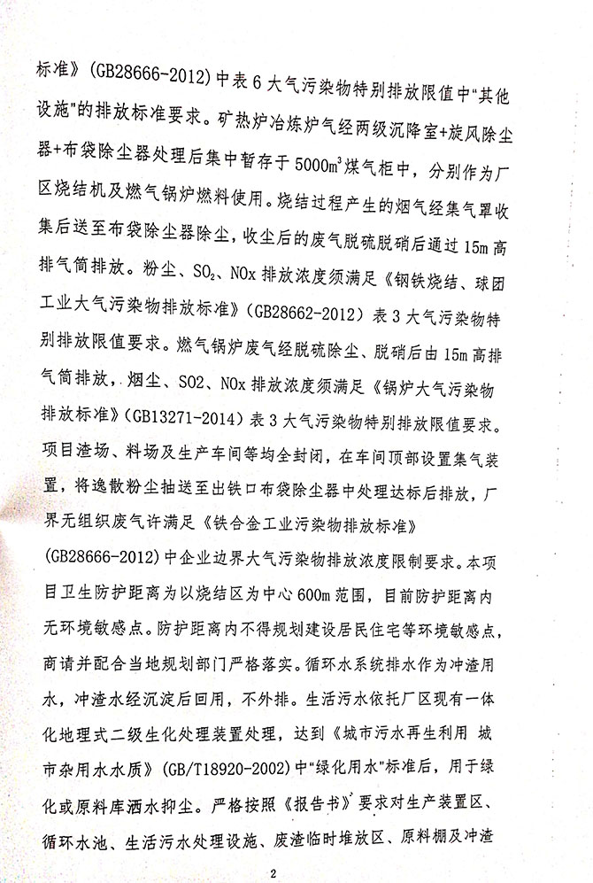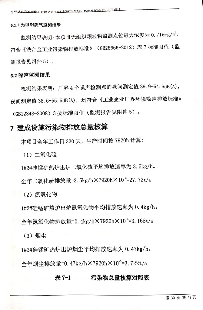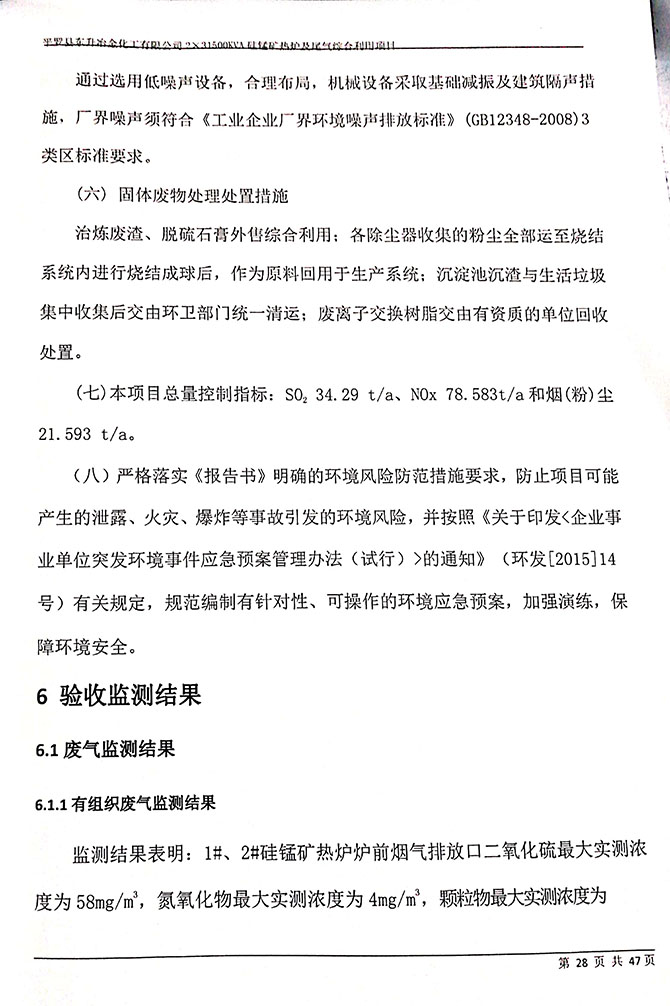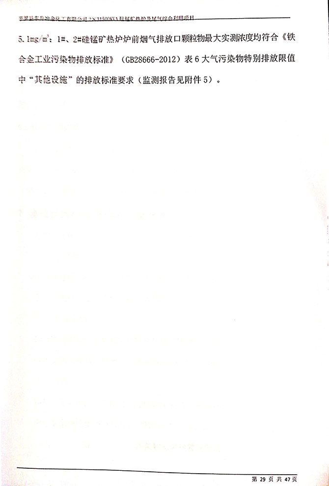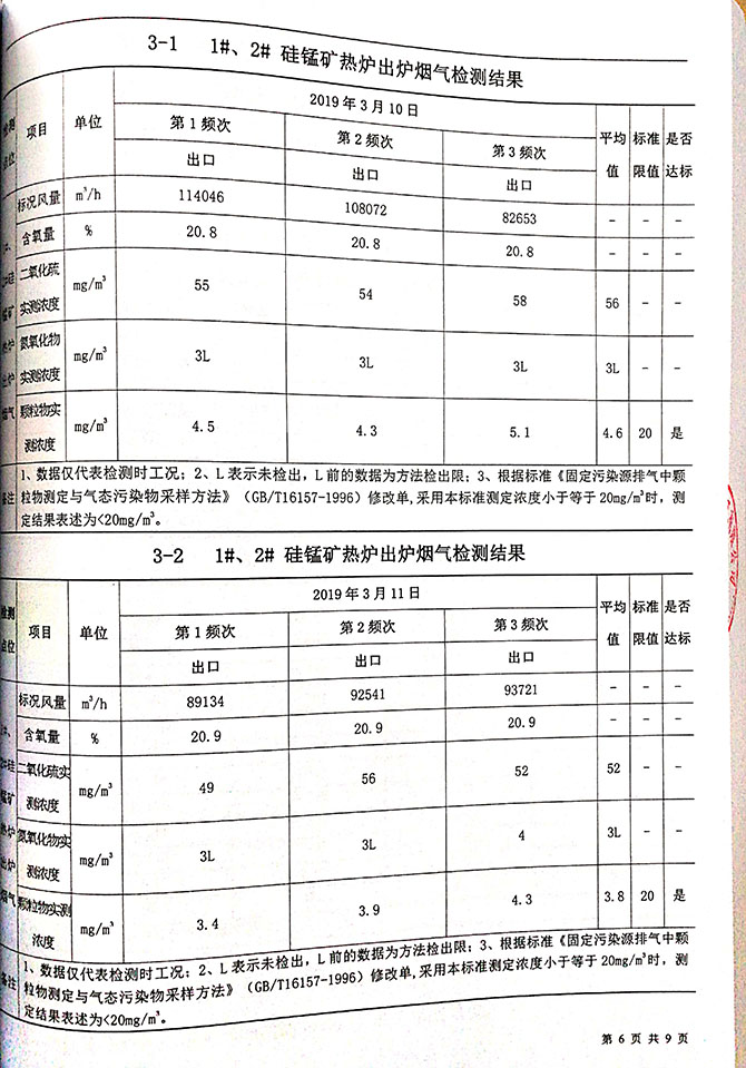 1#、2#硅锰矿热炉炉前烟气排放口,颗粒物平均实测浓度<20mg/m 3 ;1#、 2#、硅锰矿热炉炉前烟气排放口颗粒物平均实测浓度均符合《铁合金工业 污染物排放标准》(GB28666-2012)表 6 标准限值。