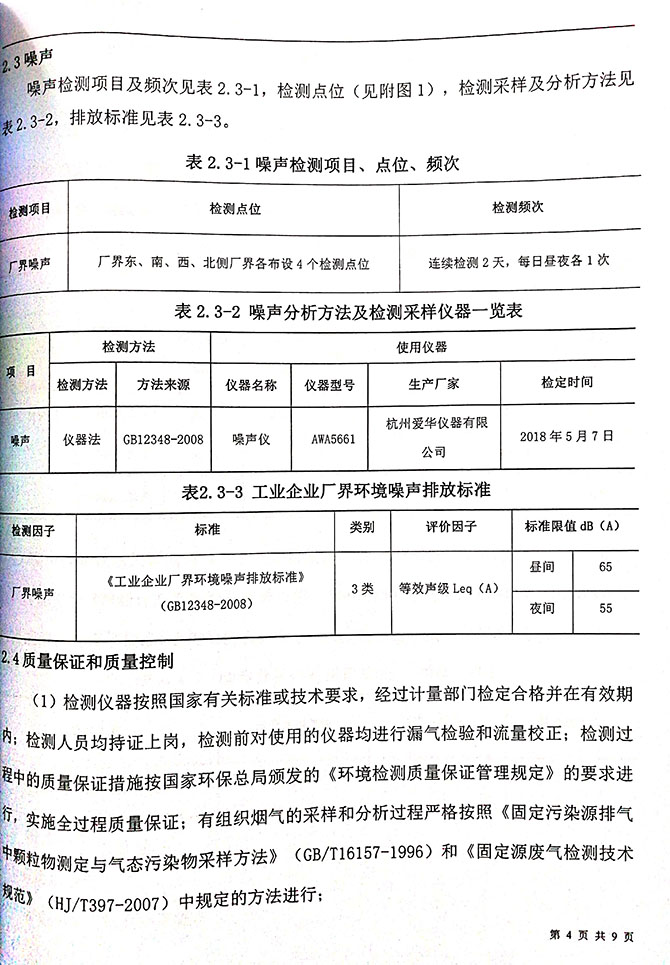 厂界 4 个噪声检测点的昼间测定值 39.9-54.6dB(A),夜间测定值 38.6-55.5dB(A) , 均 符 合 《 工 业 企 业 厂 界 环 境 噪 声 排 放 标 准 》 (GB12348-2008)3 类标准限值。