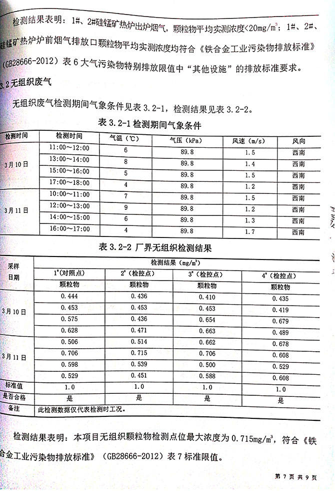 无组织颗粒物检测点位最大浓度为 0.715mg/m3,符合《铁合金工业污 染物排放标准》(GB28666-2012)表 7 标准限值。