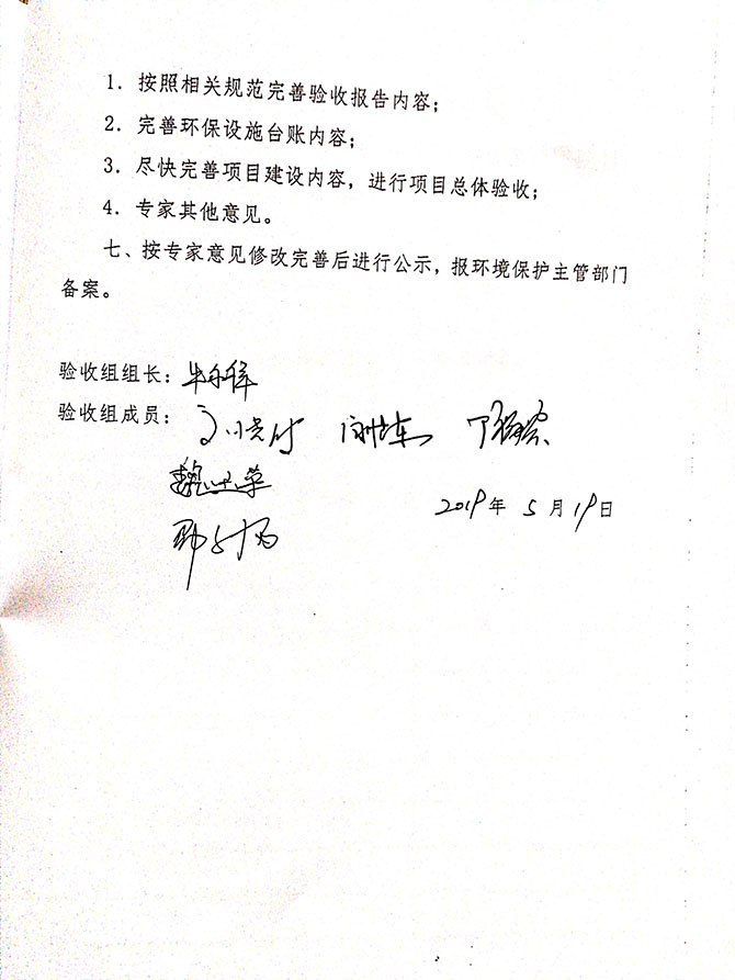 建设单位建立了较完善的环境保护管理规章制度并认真执行,项目管 理规范,环保设施运行正常。建议该项目通过阶段性竣工环境保护验收。 目前企业已按专家意见修改完善,特此向社会公众公示,公示期为一 个月(2019 年 6 月 20 日-2019 年 7 月 19 日) 该项目验收监测报告、验收意见及验收组人员信息具体内容见附件。