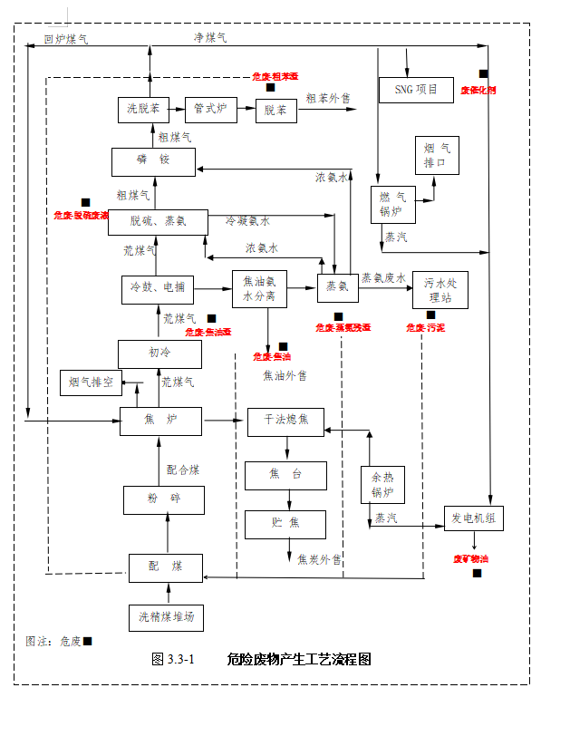 将洗精煤装入炼焦炉,经焦化后,焦炭由推焦车推出,采用惰性气体进行干法熄焦,经过熄焦后的焦炭进行储存外售;经加热后的惰性气体进入干熄焦余热锅炉,利用余热加热锅炉,产生的水蒸气送入35MW发电机组进行发电,经过换热后的惰性气体进入干熄焦介质循环使用;从焦炉产出的荒煤气进入煤气净化系统,荒煤气首先经过初冷(采用氨水间接冷却),然后进入电捕环节,以去除焦油雾,此过程产生焦油和氨水,焦油和氨水进入焦油氨水分离环节,分离出来的焦油外售,氨水进入蒸氨环节;经过初步净化的荒煤气进入脱硫、脱氨环节,此过程产生硫磺副产品外售,产生的冷凝氨水同焦油氨水分离环节产生的氨水一并进入蒸氨系统,蒸氨过程产生的浓氨水送脱硫工段作为脱硫补充液;经过脱硫后的粗煤气进入磷铵环节脱氨,此过程产生20%氨水;经磷铵工段的粗煤气进入洗脱苯工段(终冷、洗苯、脱苯),洗脱苯过程产生副产品粗苯外售;经洗脱苯后的净煤气部分作为燃料送本项目焦炉、粗苯管式炉及燃气锅炉,部分送往同期建设的SNG装置作为原料气。
