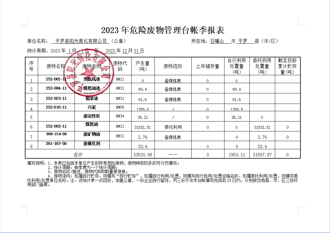 2023年危险废物管理台账季报表公示
